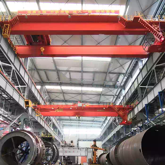 New design overhead crane is for lifting 5t~50t stuff. It's very convenient to install in new or existing workshops. This crane is easy to operate with various functions. With the advantages of compact structure, light weight and high lifting height, double girder overhead crane with electric hoist is widely used in workshops, metallurgy, warehouses and assembly shops etc.